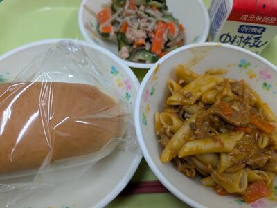 今日の給食は、コッペパン、牛乳、ペンネのトマト煮、ごぼうサラダでした。