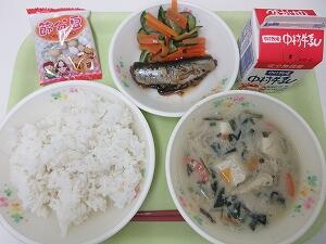 今日の給食は、麦ごはん、牛乳、いわしの梅煮、そえ野菜、呉汁、節分まめでした。節分にあわせた行事食でした。