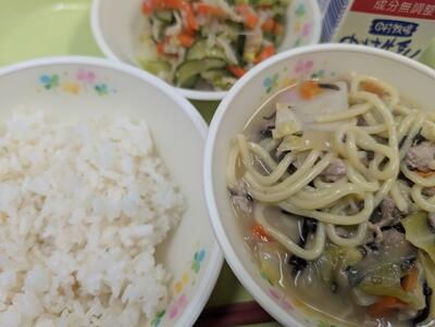 本日の給食は、野菜や海鮮の旨味がたっぷり詰まった「ちゃんぽん」が登場しました。 キャベツや人参など、火を通すことで甘みを増した野菜をたっぷり摂取できる、育ち盛りの子どもたちに嬉しいメニューです。