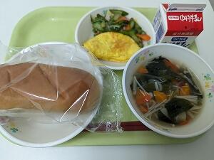 今日の給食は、チーズパン、牛乳、オムレツ、アスパラサラダ、やさいスープでした。