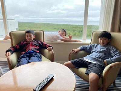 予定通り先ほど到着し、子供たちは部屋でゆっくりしています。10階で全部屋オーシャンビュー。