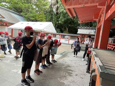 青島神社では海幸と山幸の神話を聞き、参拝後、ビロー樹を見学しました。