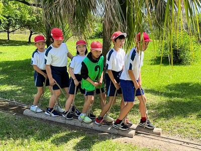 ④ 午後の活動は、フィールドアスレチックです!たくさんの種目をこなします。池に落ちた子はいなかったかな?