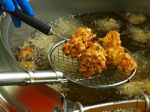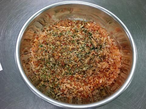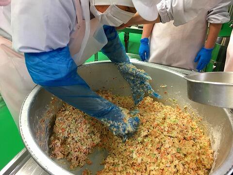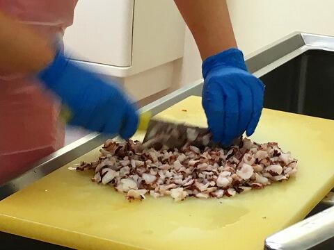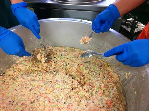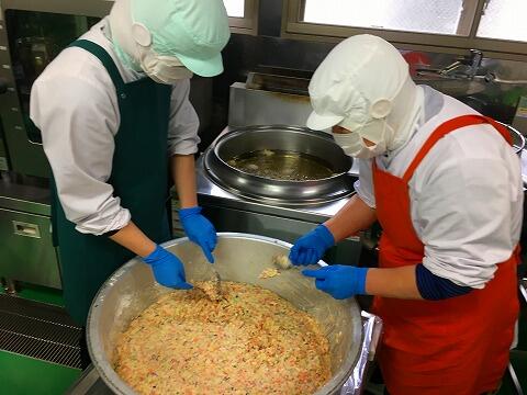 大人気の「たこ焼きふう」が給食に初登場!野菜もたくさん摂取してほしい・・・との思いでたくさん入れました(キャベツだけでこの写真の量)!粗みじん切りにするのも大変な作業!!生地を混ぜ合わせるのも一苦労!野菜の量が多かったので、ほどよい固さの生地になるまで、小麦粉をこしながら入れ、何度も混ぜ合わせました。その後、手作業で揚げ油の中に投入!1時間ほどこの作業を続けて揚げていきました。揚げた後は、特製ソースでからめ、最後にかつおぶし・青のりも加え、出来上がり!