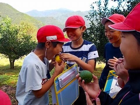 ゆずの収穫体験では、収穫したてのゆずをガブリ!