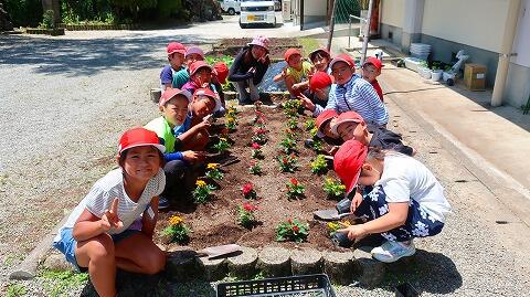 前もって整えていた花壇に、新しい苗を大事そうに植える子どもたち。
