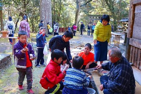 儀式開催前に猪肉(塩焼き)の振る舞いに舌鼓。