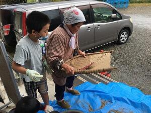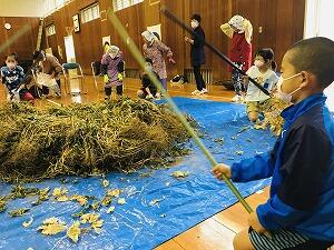 あらかじめ収穫し、乾燥させていた小豆を棒でたたいてサヤから小豆を出します。