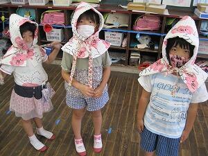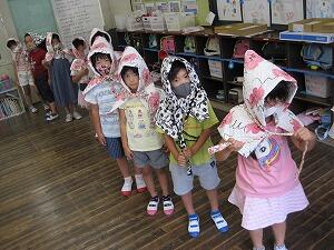 以前、西米良村のボランティアの方々からおくられた手作りの防災頭巾を使いました。