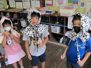 来月の小中合同学習発表会で、白張りを着、御幣を持って神楽体操を披露する予定です。