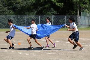 2メートル四方のシートにソフトバレーボールを入れ、リレー方式で運びます。