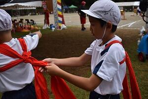 準備の際には、6年生が優しく1年生にタスキの結び方を教えていました。