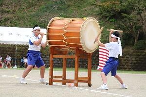 中学生の徒競走、ダンス、米良太鼓など、どれも力強く、小学生はあこがれのまなざしで見つめていました。