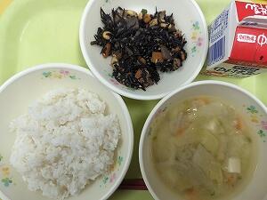 今日の給食は、麦ご飯、ひじき炒め、豚汁でした。