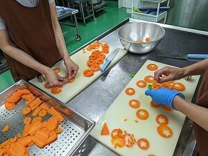 調理員さんたちが、子どもたちが食べやすい大きさを考えながら毎日丁寧に切ってくれています。