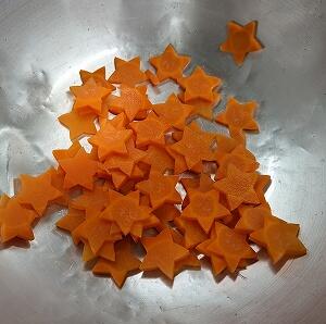 今日は、七夕汁のにんじんを調理員さんたちが、子どもたちが楽しい気持ちになれるように星型やうさぎ型にぬいてくれました。かまぼこも★がのっているものを提供しました。
