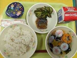 今日の給食は、麦ご飯、さばの生姜煮、きゅうりのあえもの、たなばた汁、七夕デザートでした。