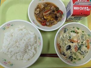 今日の給食は、麦ご飯、チンジャオロース、かきたま汁でした。