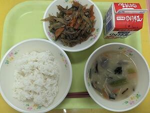 今日の給食は、ごぼうや切干大根などを使い食物繊維たっぷりの給食でした。