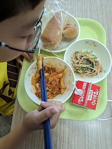 3年生は、『ペンネとトマト煮がおいしかったです。まとー!』でした。3年生は、この間実施した食事のマナーの授業を受けて今でも継続してお皿の持ち方や食べる時の姿勢がとてもよいです(^^)『先生、ペンネは箸で食べる時ペンネの空洞に箸をとおして食べると食べやすいですよ。』と教えてくれました。給食は、スプーンと箸しか出せませんが、箸を使って上手に食べていました。