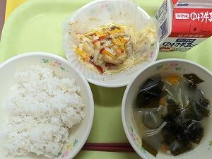 今日の給食は、麦ご飯、いり豆腐、春雨の酢の物でした。