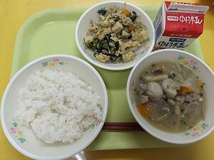 今日の給食は、麦ごはん、高野豆腐の卵とじ、根菜ごま汁でした。牛乳は毎日つきます。
