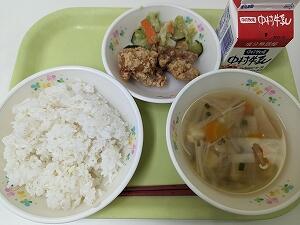 今日の給食は、麦ごはん、牛乳、とりのから揚げ、甘酢和え、五目豆腐汁でした。