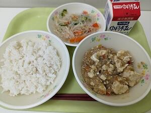 今日の給食は、麦ごはん、牛乳、マーボー豆腐、春雨サラダでした。