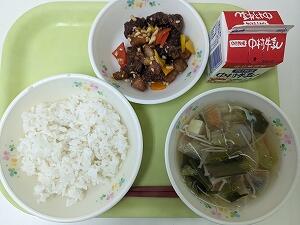 今日の給食は、麦ごはん、牛乳、厚揚げの中華風煮、汁ビーフンでした。
