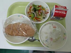 今日の給食は、コッペパン、牛乳、シチュー、フレンチサラダでした。