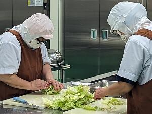 また、調理員さんの様子もお伝えします。今日は、キャベツを切っているところです。