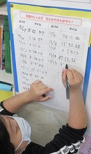 また、ある学級では『給食の準備みんなでがんばろう』という掲示をみつけました。何が書いているかというと日付と給食の準備にかかった時間が書かれていました。毎日電子黒板のタイマーでタイムを計ってみんなでがんばっているようです。