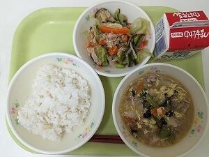 今日の給食は、麦ごはん、牛乳、五目きんぴら、かきたま汁でした。