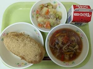 今日の給食は、きなこ揚げパン、牛乳、ミネストローネ、じゃがいものベーコン炒めでした。