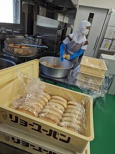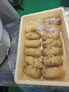 きなこ揚げパンは、パン屋さんから納品されたコッペパンを給食センターで揚げてきな粉とさとうと塩をブレンドした粉をつけます。