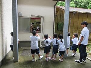 また、学校探検で1年生と2年生が給食室にも来てくれました。2年生から1年生に給食は何人で作っているでしょう?とクイズが出されていました。答えは、全部で6人の調理員さんがいますと2年生がクイズ形式で1年生に教えていました。小中学校合わせて、約115食を1日4人の調理員で作っています。交代で勤務に出ているので全部で6人の調理員さんがいます。