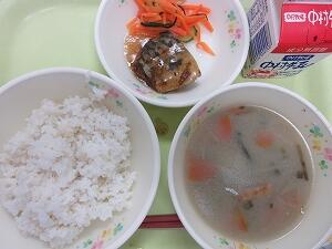 今日の給食は、麦ご飯、牛乳、さばの生姜煮、塩昆布和え、じゃがいものみそしるでした。