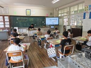 また、学校探検で1年生と2年生が給食室にも来てくれました。2年生から1年生に給食は何人で作っているでしょう?とクイズが出されていました。答えは、全部で6人の調理員さんがいますと2年生がクイズ形式で1年生に教えていました。小中学校合わせて、約115食を1日4人の調理員で作っています。交代で勤務に出ているので全部で6人の調理員さんがいます。