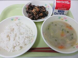 今日の給食は、麦ご飯、牛乳、ひじきの炒め煮、かぼちゃ団子汁でした。