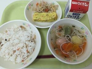 7月5日の給食は、ちらし寿司、牛乳、千草焼、甘酢和え、七夕汁でした。