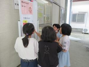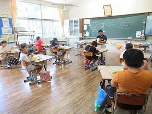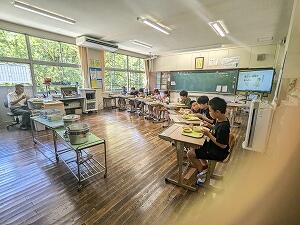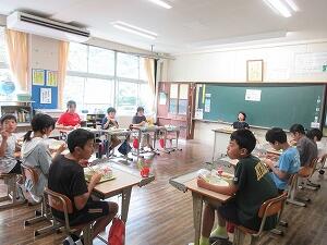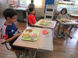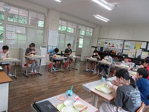 なすは、苦手な子が多いかな~と思いながら教室に行ったのですが、ペロリと食べていました。なすは、子どもたちが食べやすいように調理員さんがうすく切ってくれました。また、トウバンジャンを少し使って暑い夏にピッタリの味付けでした。