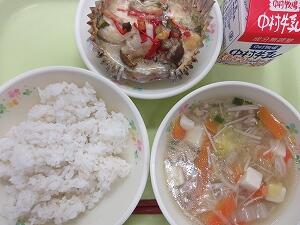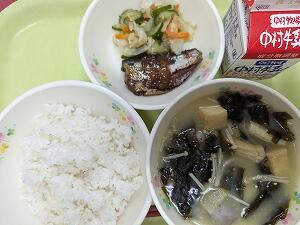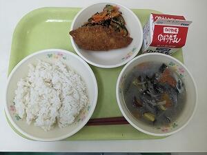 7月4日の給食は、麦ご飯、牛乳、さばの竜田揚げ、ゆかりあえ、いなか汁でした。