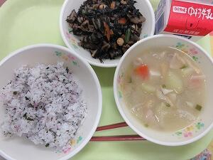 今日の給食は、ゆかりわかめごはん、牛乳、ひじきの五目煮、豚汁でした。