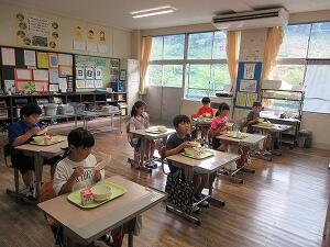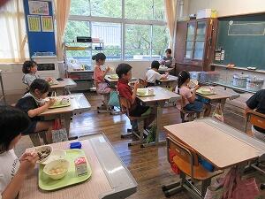 最後に不思議な机の並び方で食べていた学級の様子を紹介します。虹のような天の川のような形に机を並べて楽しそうに食べていました。
