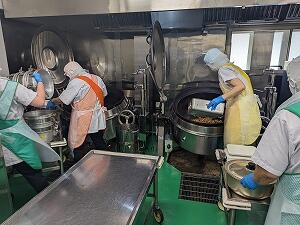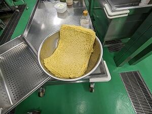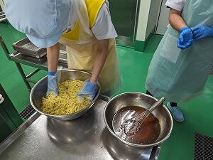 冷やし中華を作っているところの一部を紹介します。冷やし中華の中華麺や具材は、スチームコンベクションオーブンで蒸して加熱します。それを真空冷却器で冷やします。冷やし中華の中華麺を蒸して冷却したら写真のようにくっつきます。それを調味料を使ってほぐします。ほぐれた後に他の具材と一緒に釜でまぜあわせます。冷たい和え物は、いつもは、タライでまぜあわせるのですが、冷やし中華は量が多いので釜でまぜあわせます。