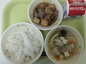 今日の給食は、麦ご飯、牛乳、なすのみそ炒め、すまし汁でした。