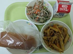 1学期最後の給食は、ミルクパン、牛乳、ペンネ、ごぼうのサラダでした。