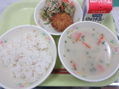 今日の給食は、麦ごはん、牛乳、煮しめ楽コロッケ、切干大根のツナ和え、豆乳みそ汁でした。