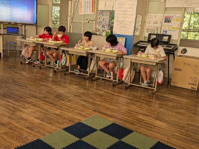 4年生の教室では、今日は放送委員会の子どもたちも放送のお仕事の日ではないので全員そろったので、むかい合って食べています。と教えてくれました。