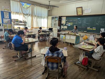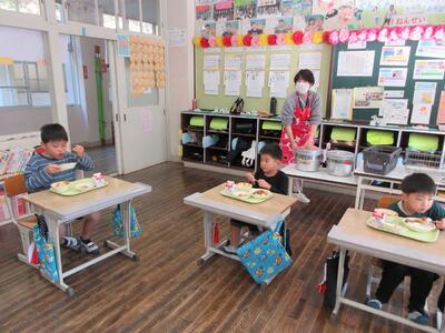 3年生の教室では、煮しめ楽コロッケについて調べたことあります!や西米良という漢字ではなく、煮しめをつかっているから、煮しめ楽コロッケという字を書くんですよ(^^)/とたくさん教えてくれました。たくさん興味・関心をもっていてくれて嬉しいです。今日はグループにして食べています(^^)/と教えてくれました。学校給食は、ただ食べるだけではなく、楽しく共食を学ぶ場でもあります。いつも楽しく食べていますが、より一層嬉しそうに楽しく食べていました。